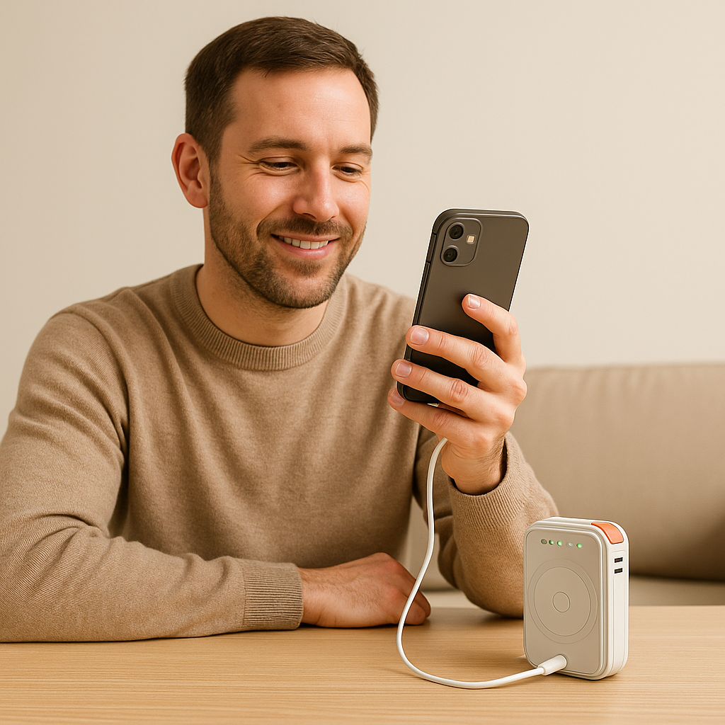 FAST & CHARGE est né d’un vécu très concret : malgré nos power banks, il nous manquait toujours… le chargeur du chargeur. Entre trajets, cours et réunions, cette contrainte tuait l’autonomie et l’efficacité. Nous avons donc imaginé unebatterie 2-en-1quise recharge directement au mur, offre lacharge sans fil magnétiqueet lacharge filaire rapide, avec unsupport pliablepour travailler, appeler ou regarder du contenu confortablement.